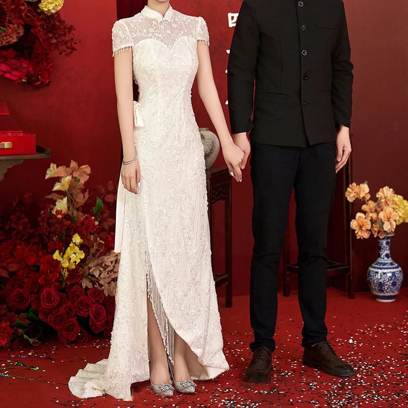 Short-Sleeve Bead Fringe Bow A-Line Evening Gown